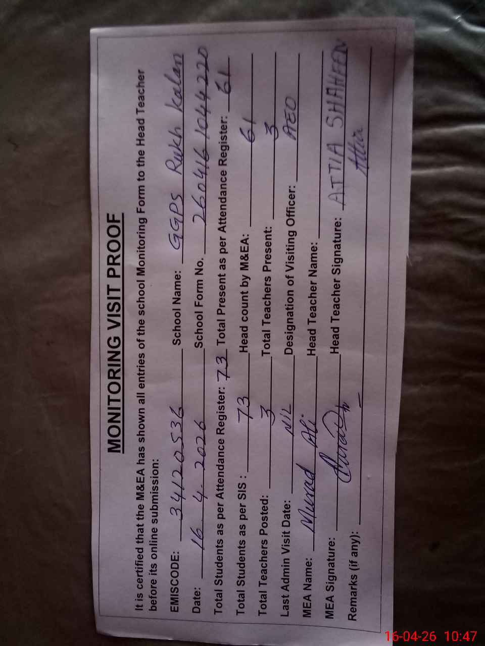 | EMIS Code: 34120536 | Name of School: GGPS RUKH KALAN | |||