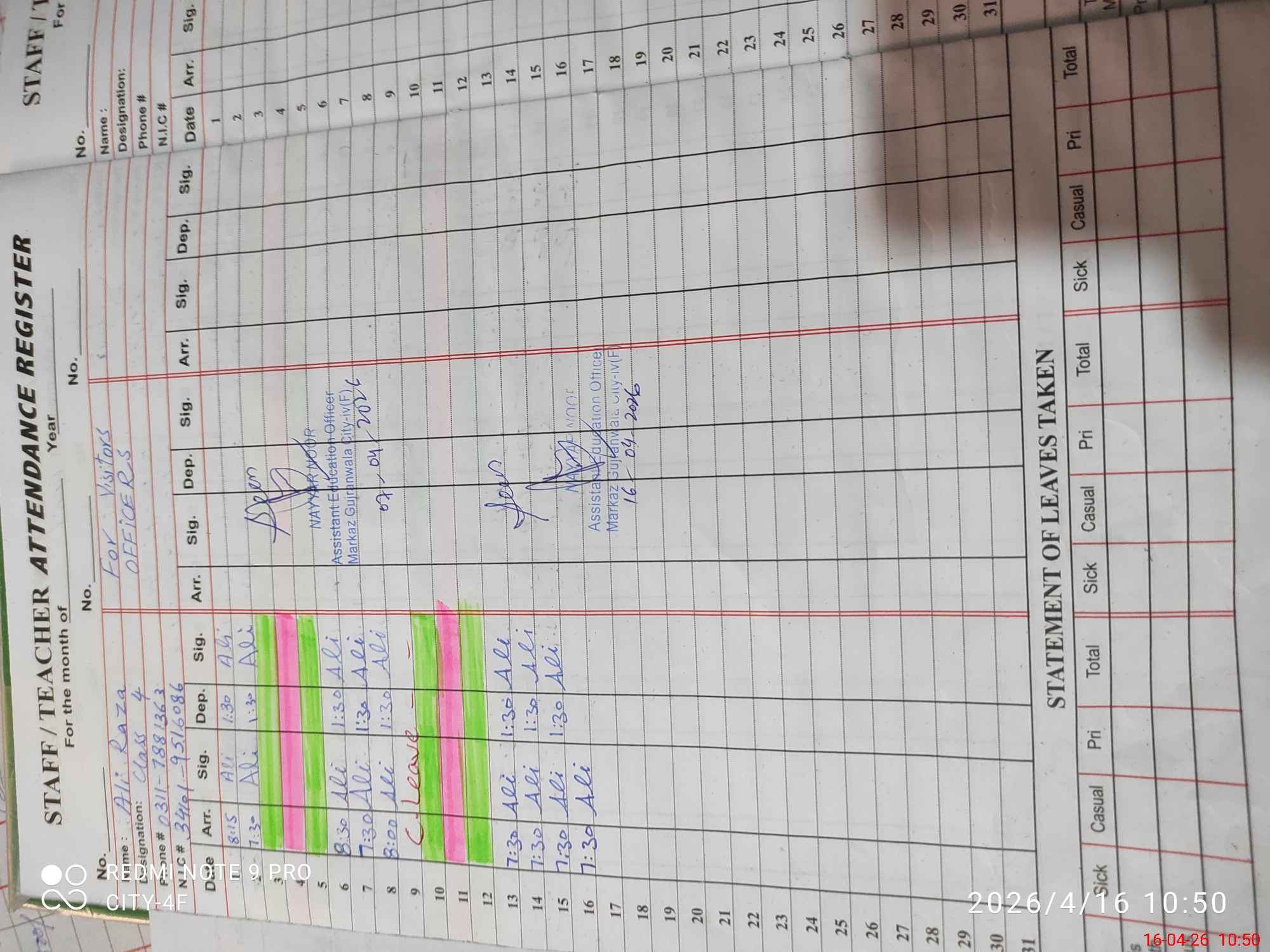 | Name: SI**** AM**** Designation: (School Headmaster's/Headmistress's) PST Phone/Cell Number: 03**** |