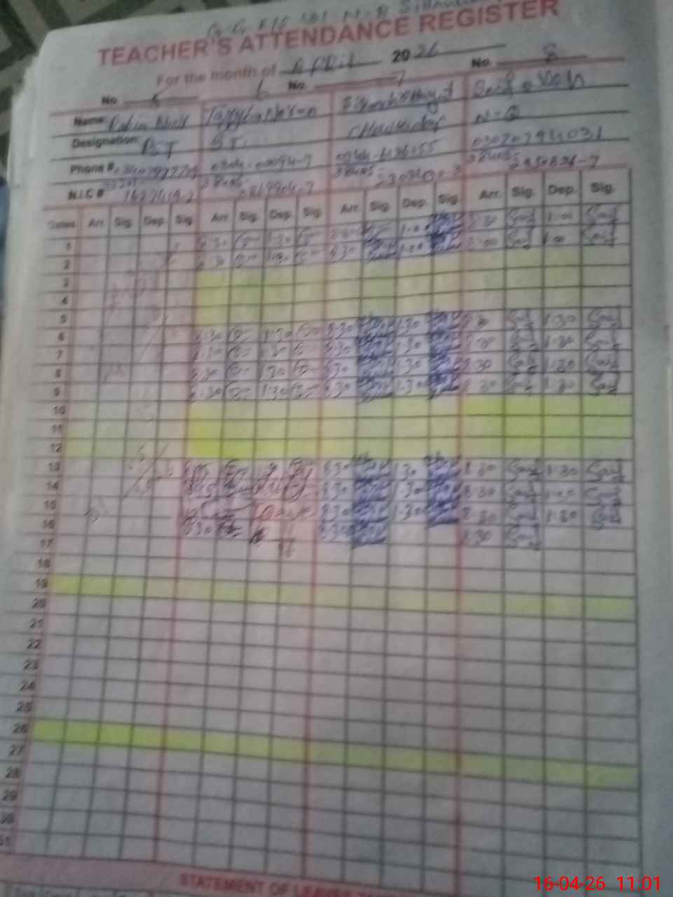 | CNIC | Full Name | Designation | R/C | Absence During Last Calender Month |