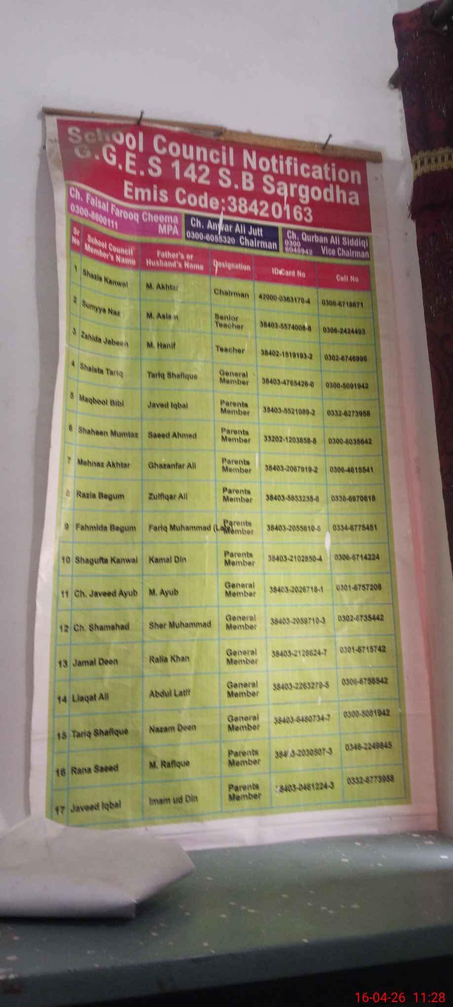 | EMIS Code: 38420163 | Name of School: GGES CHAK NO.142 SB | |||