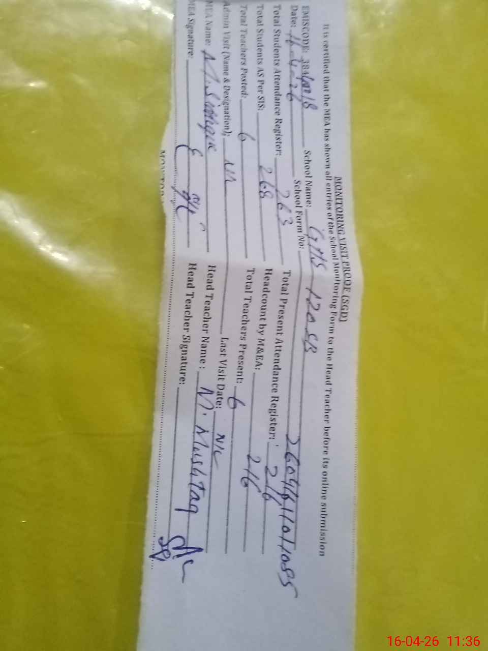| Attendance Register | Head Teacher | MEA with School | Visit Proof |