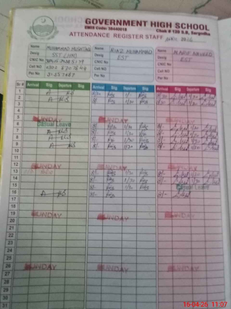 | CNIC | Full Name | Designation | R/C | Absence During Last Calender Month |