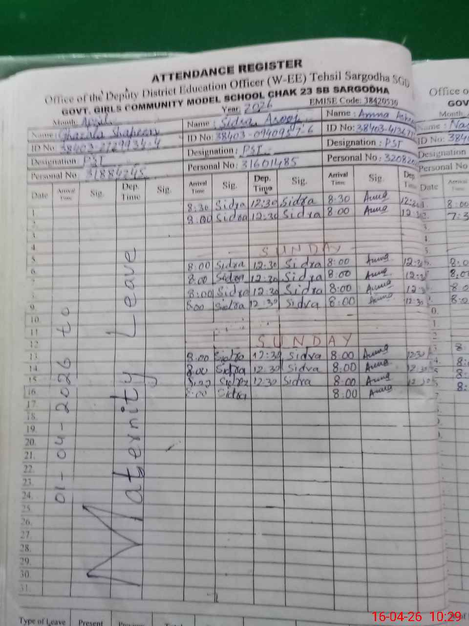 | 38**** | Gh**** Sh**** | PST Arts | Regular | 2 | 0 | 0 | 0 | 0 | 0 | 0 | 0 | 2 | Maternity |