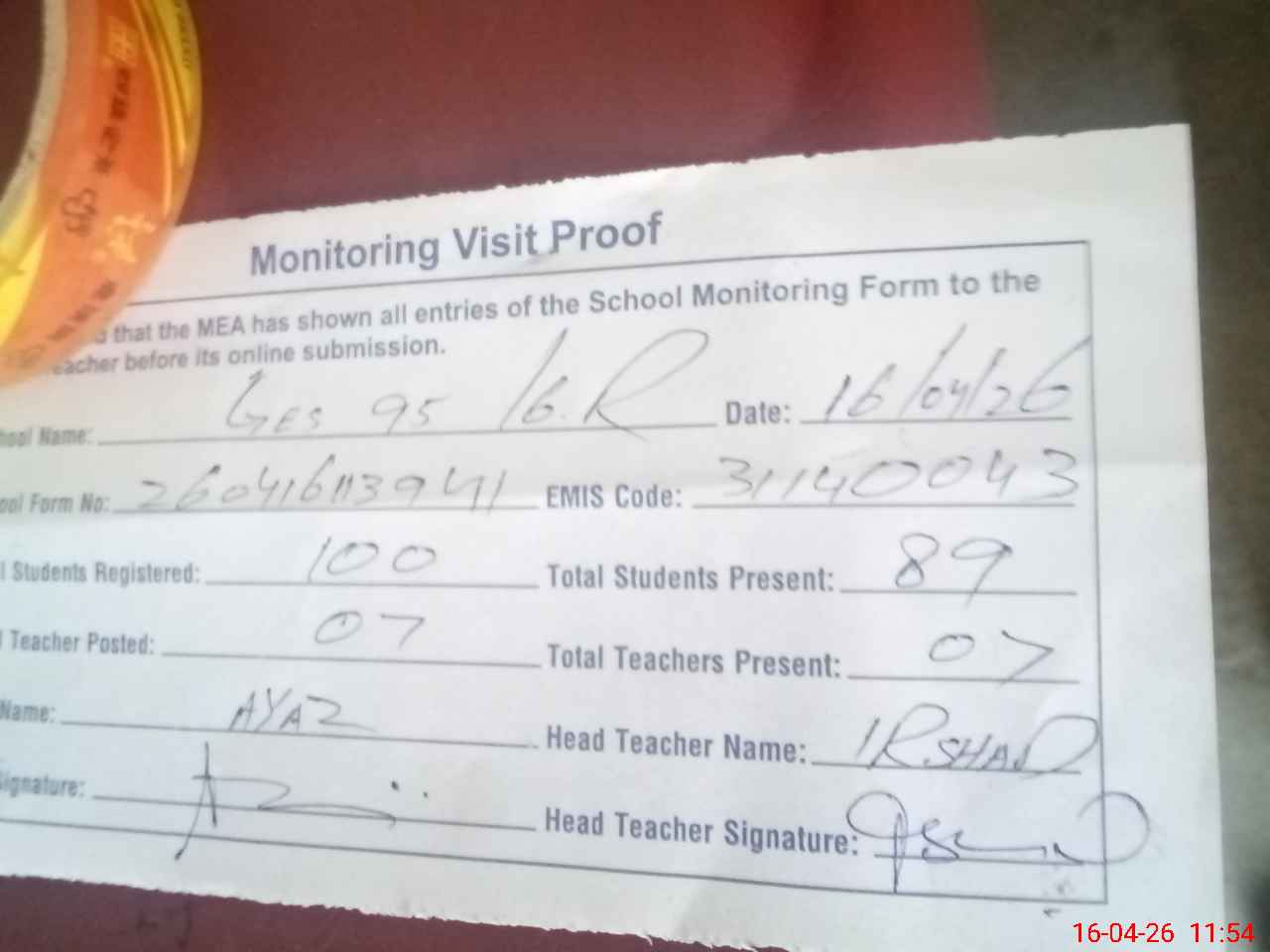 | Attendance Register | Head Teacher | MEA with School | Visit Proof |