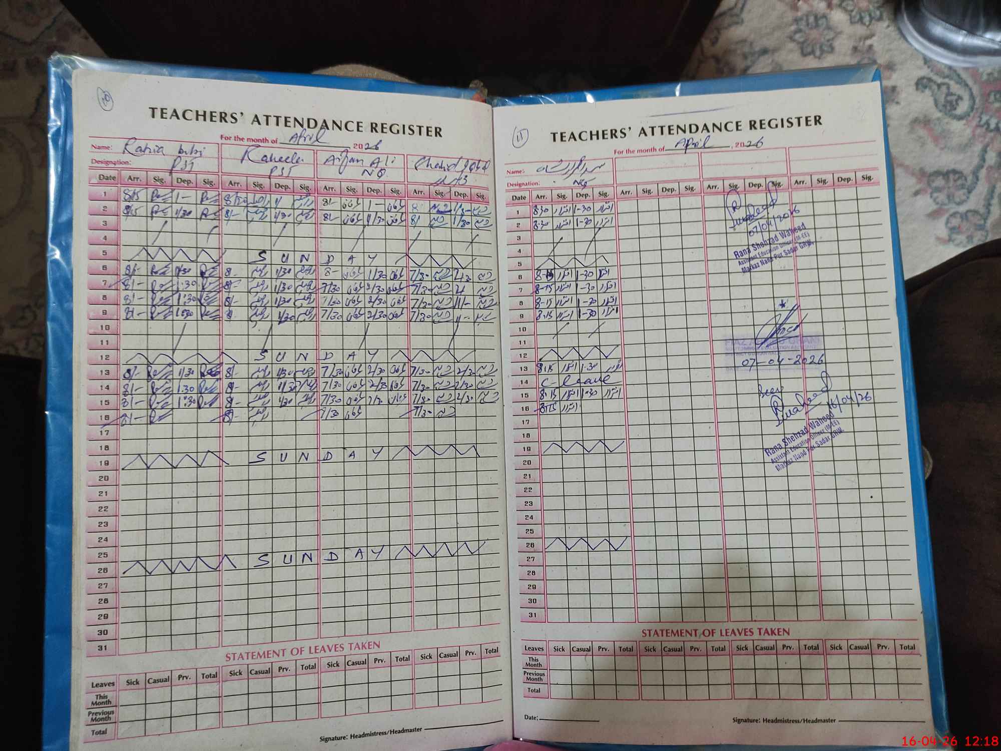 | CNIC | Full Name | Designation | R/C | Absence During Last Calender Month |