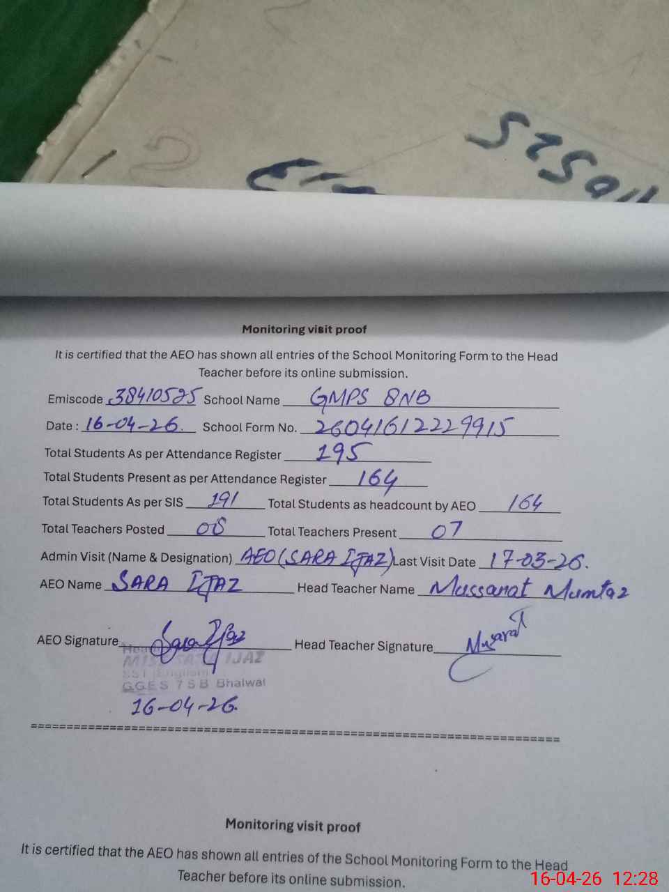 | Attendance Register | Head Teacher | MEA with School | Visit Proof |