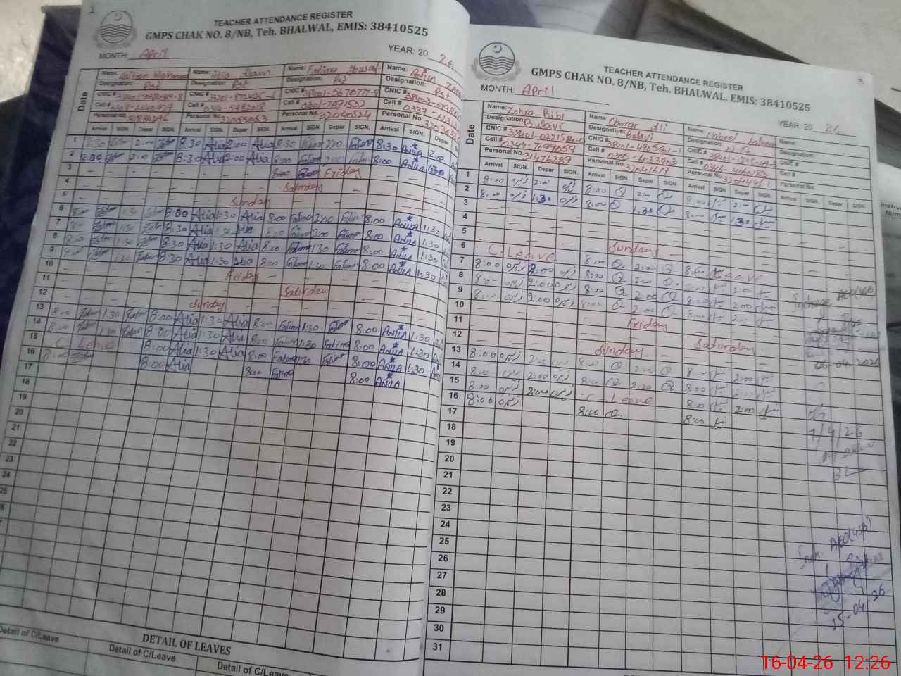 | CNIC | Full Name | Designation | R/C | Absence During Last Calender Month |