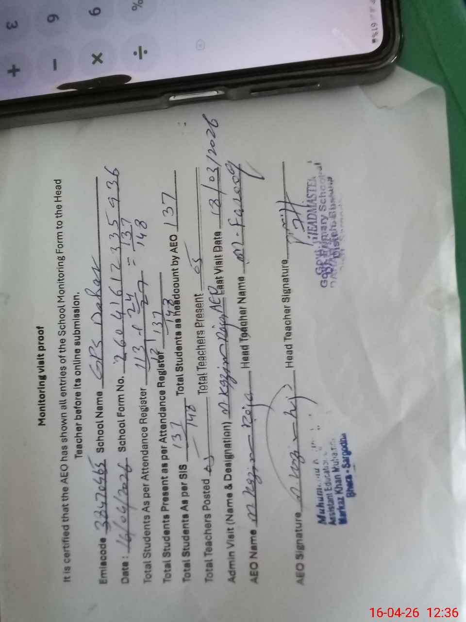 | Attendance Register | Head Teacher | MEA with School | Visit Proof |