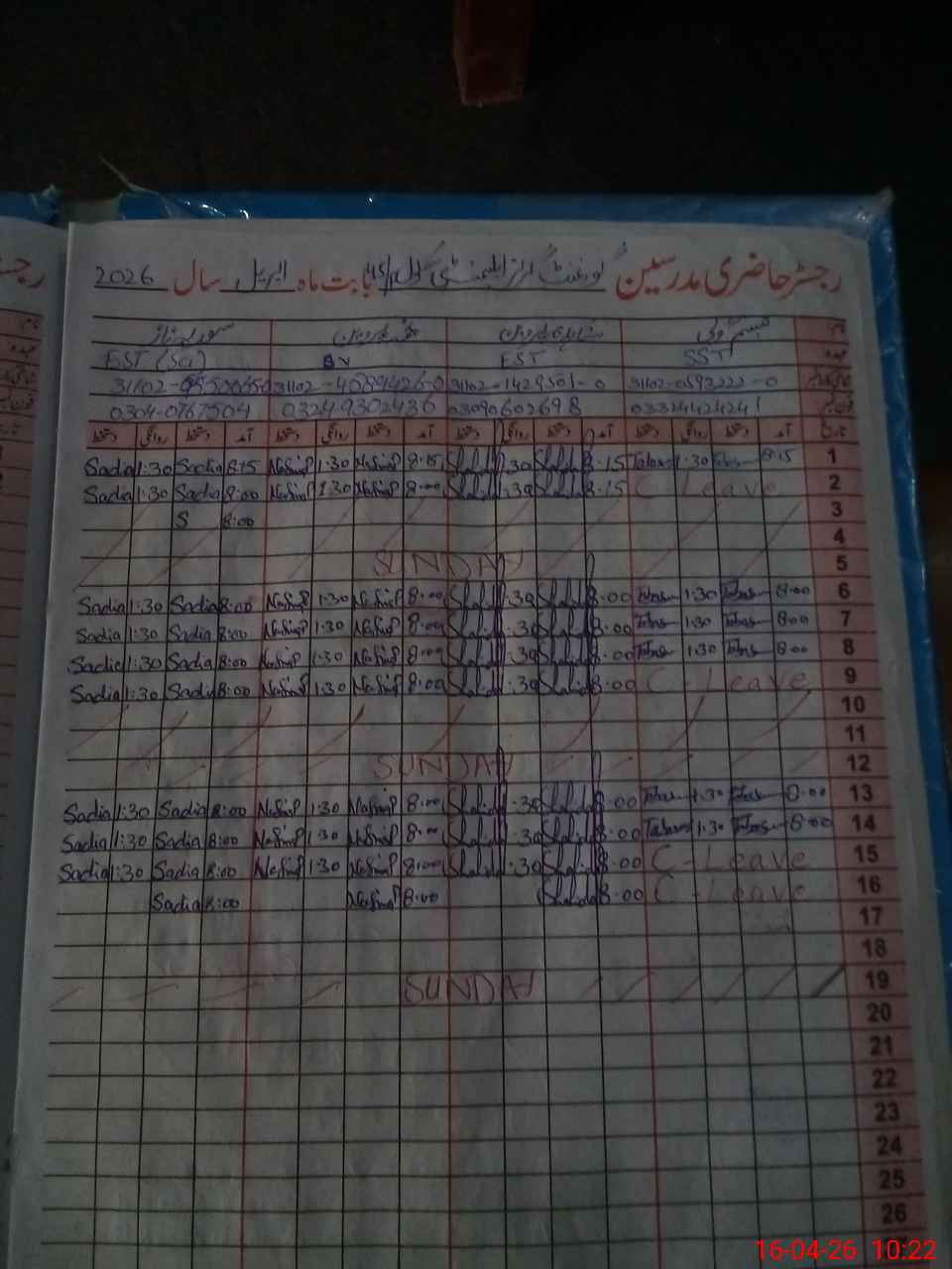 | CNIC | Full Name | Designation | R/C | Absence During Last Calender Month |