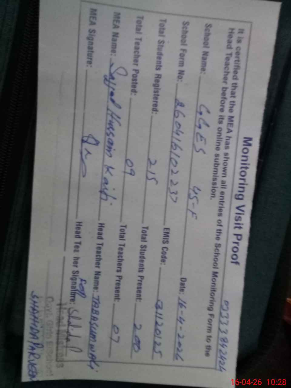 | Attendance Register | Head Teacher | MEA with School | Visit Proof |
