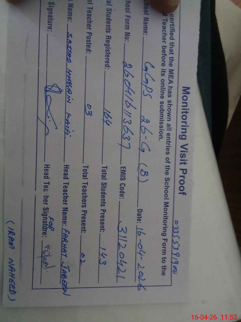 | Name: FA**** JA**** Designation: (School Headmaster's/Headmistress's) PTS Phone/Cell Number: 03**** |