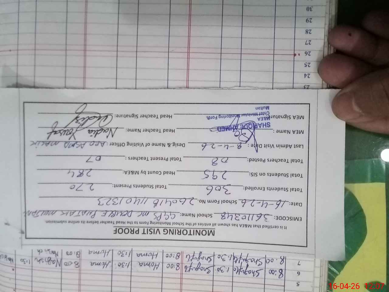| Attendance Register | Head Teacher | MEA with School | Visit Proof |