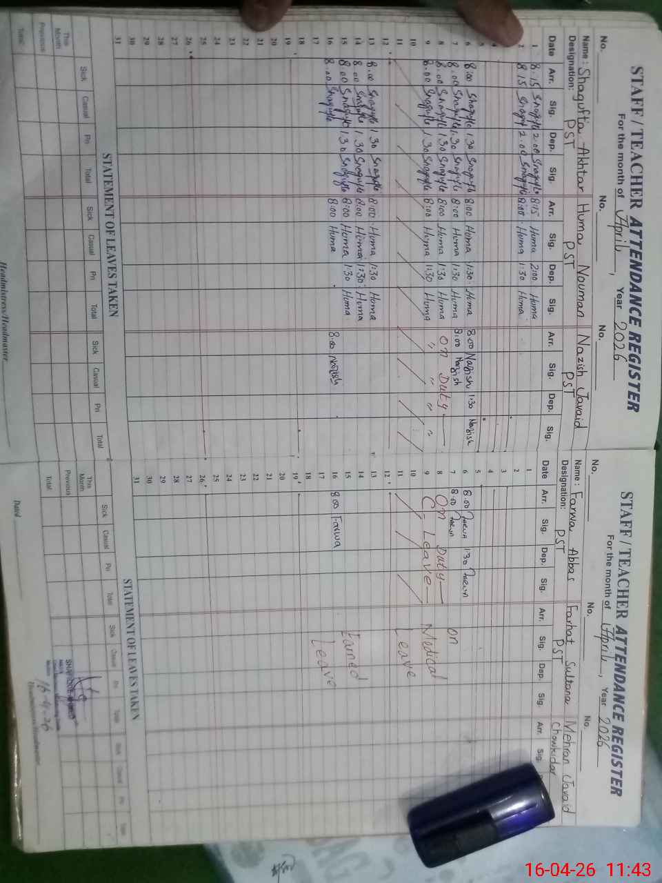 | Leave | Duty | Absent | Maternity | Medical | Ex- Pak |