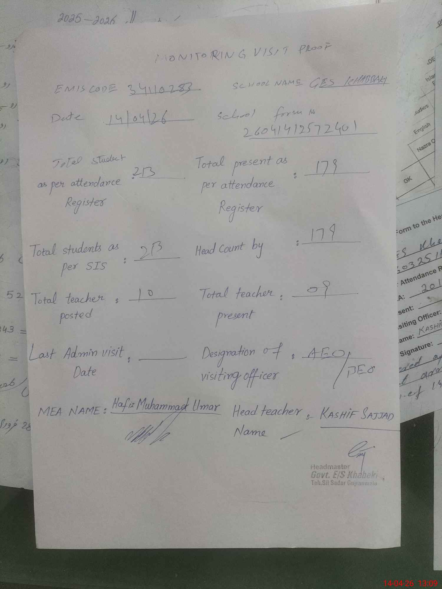 | Attendance Register | Head Teacher | MEA with School | Visit Proof |