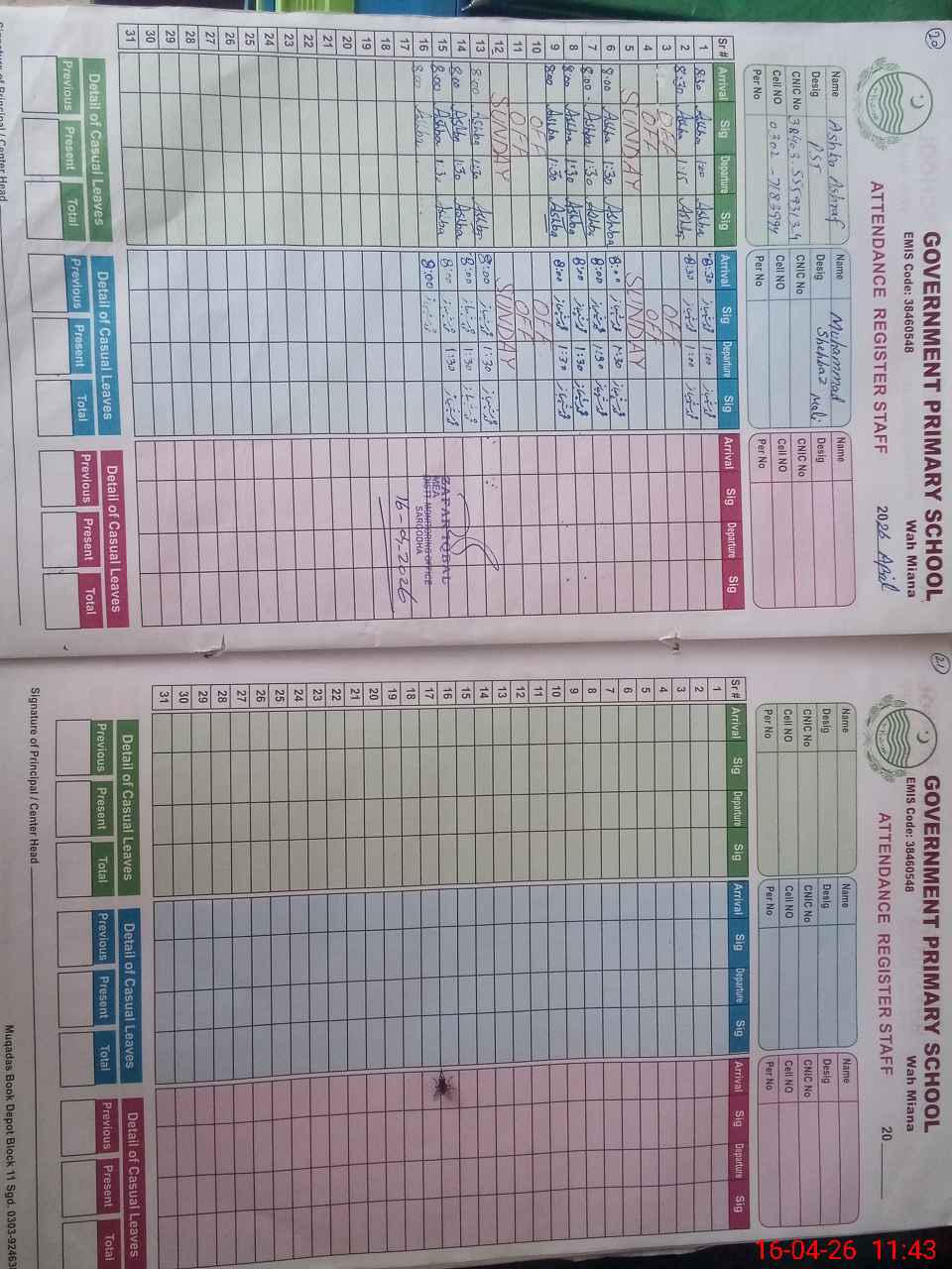 | CNIC | Full Name | Designation | R/C | Absence During Last Calender Month |