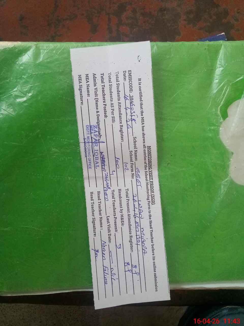 | Attendance Register | Head Teacher | MEA with School | Visit Proof |