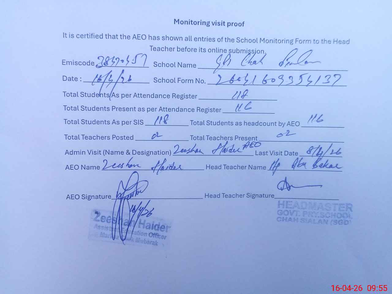| Attendance Register | Head Teacher | MEA with School | Visit Proof |
