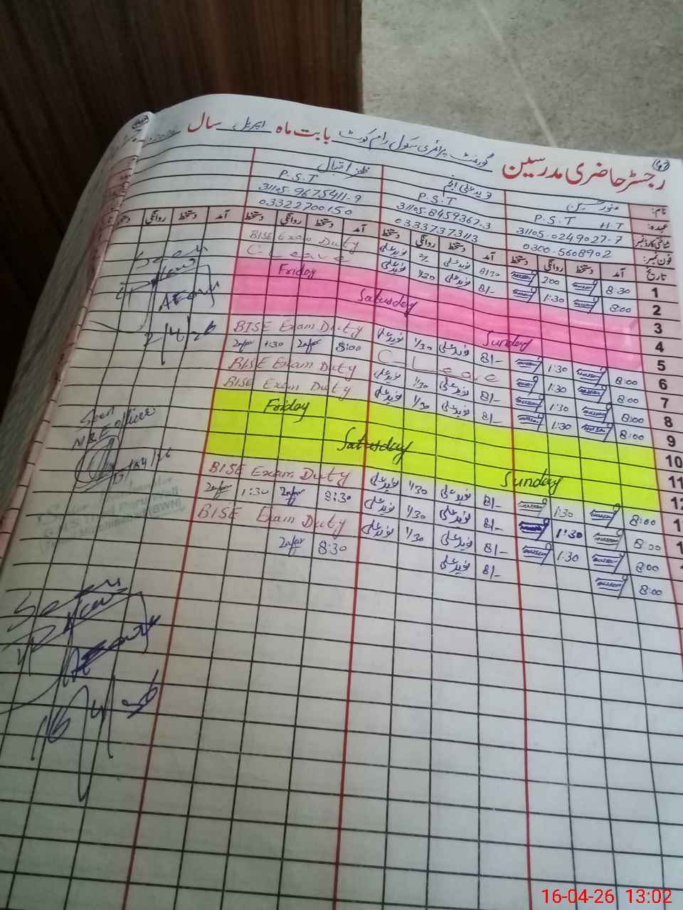 | CNIC | Full Name | Designation | R/C | Absence During Last Calender Month |