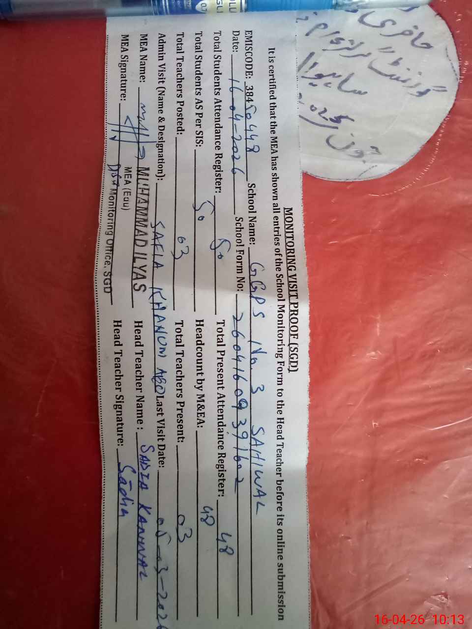 | EMIS Code: 38450448 | Name of School: GGPS NO.3 SAHIWAL | |||