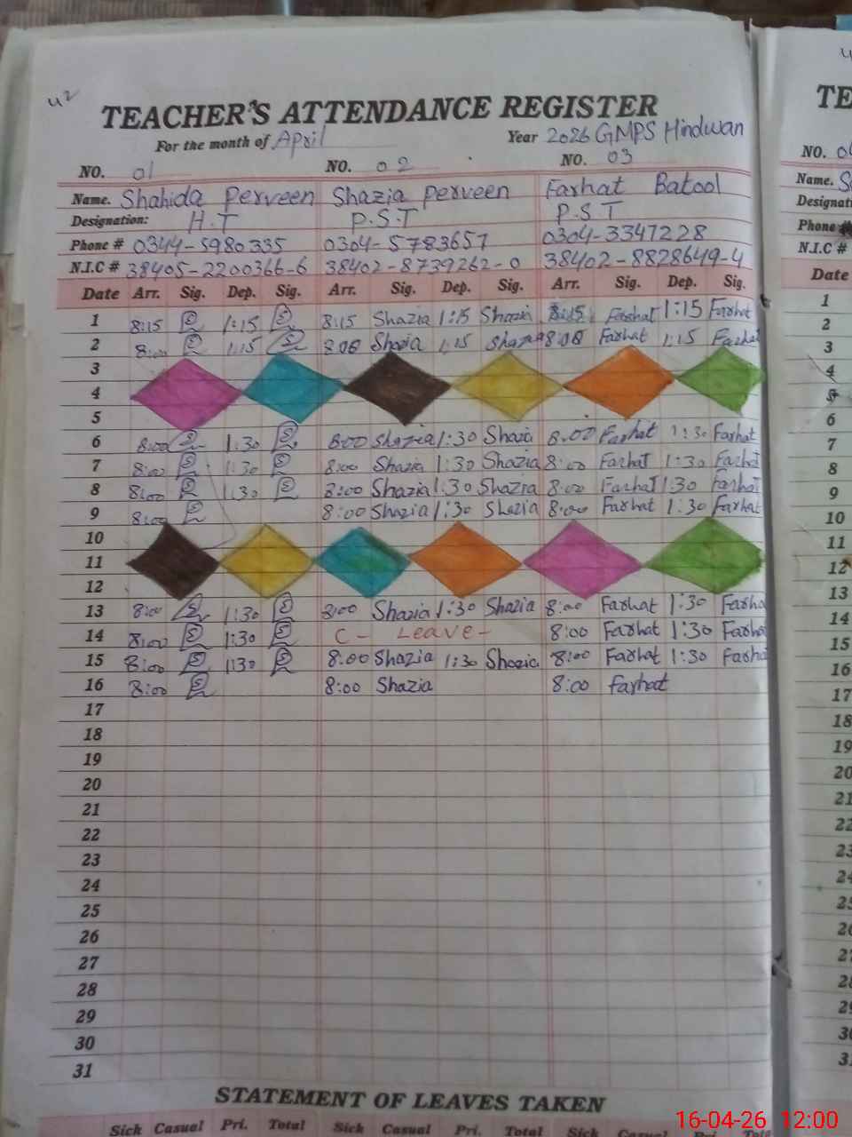 | CNIC | Full Name | Designation | R/C | Absence During Last Calender Month |