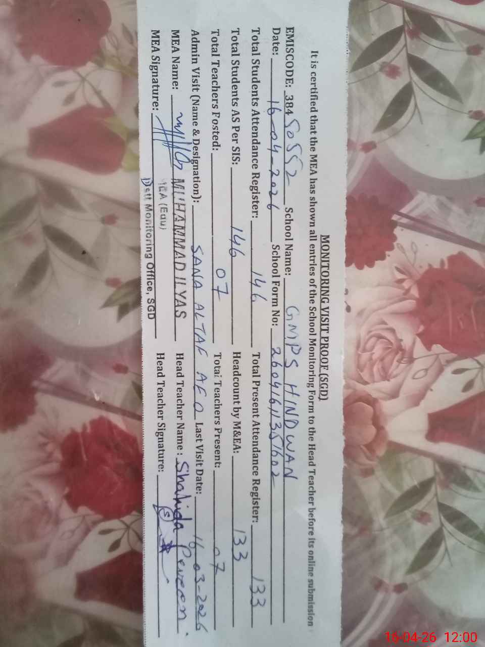 | Attendance Register | Head Teacher | MEA with School | Visit Proof |