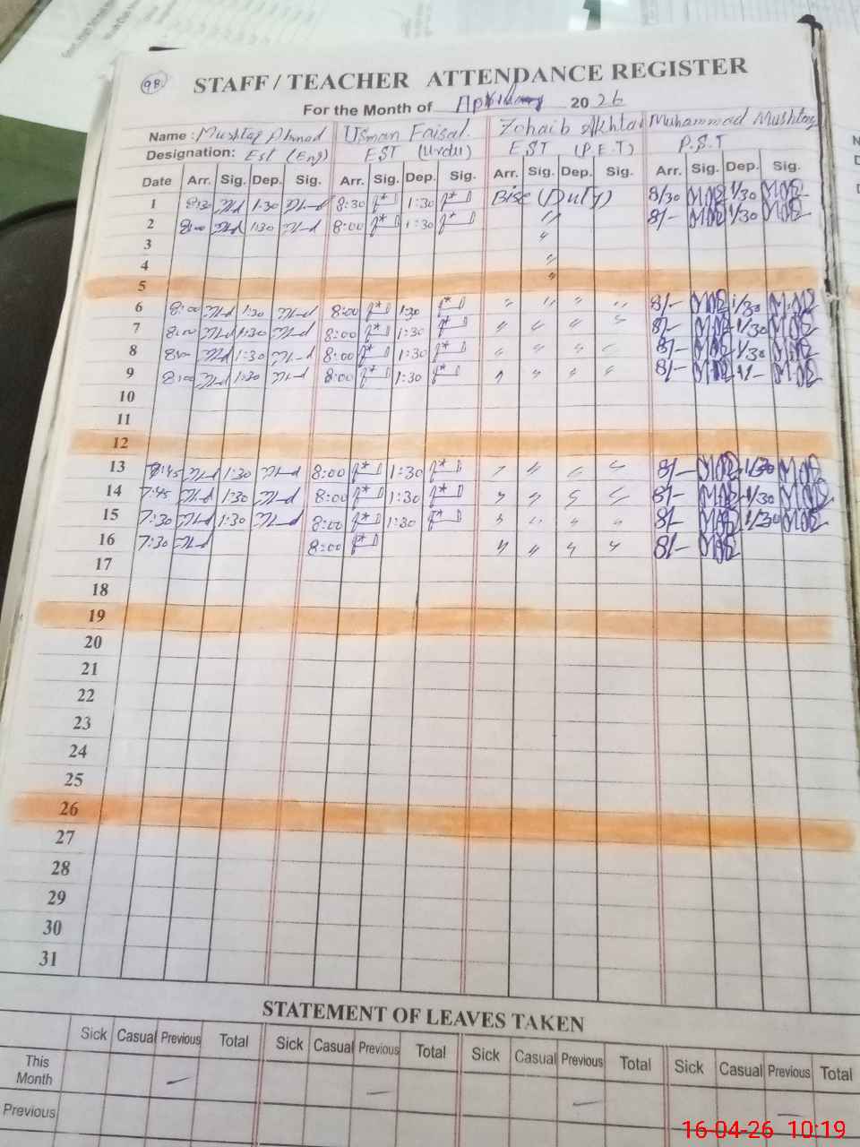 | 34**** | Zo**** Ak**** | EST (Math) | Regular | 0 | 0 | 0 | 0 | 0 | 0 | 0 | 0 | 0 | Exam Duty |