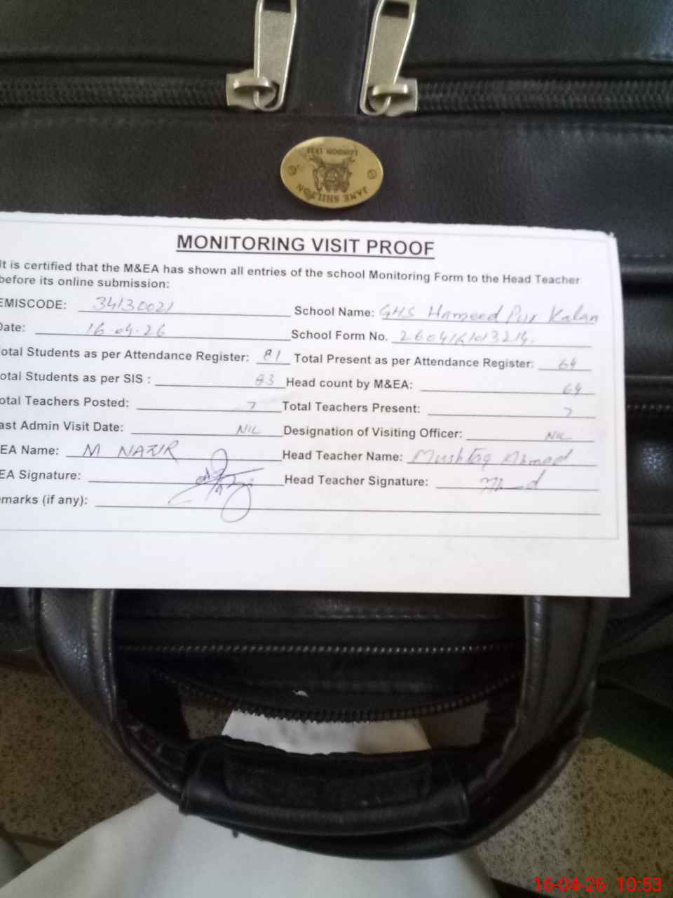 | Attendance Register | Head Teacher | MEA with School | Visit Proof |