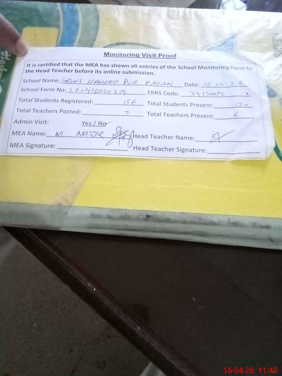 | Attendance Register | Head Teacher | MEA with School | Visit Proof |