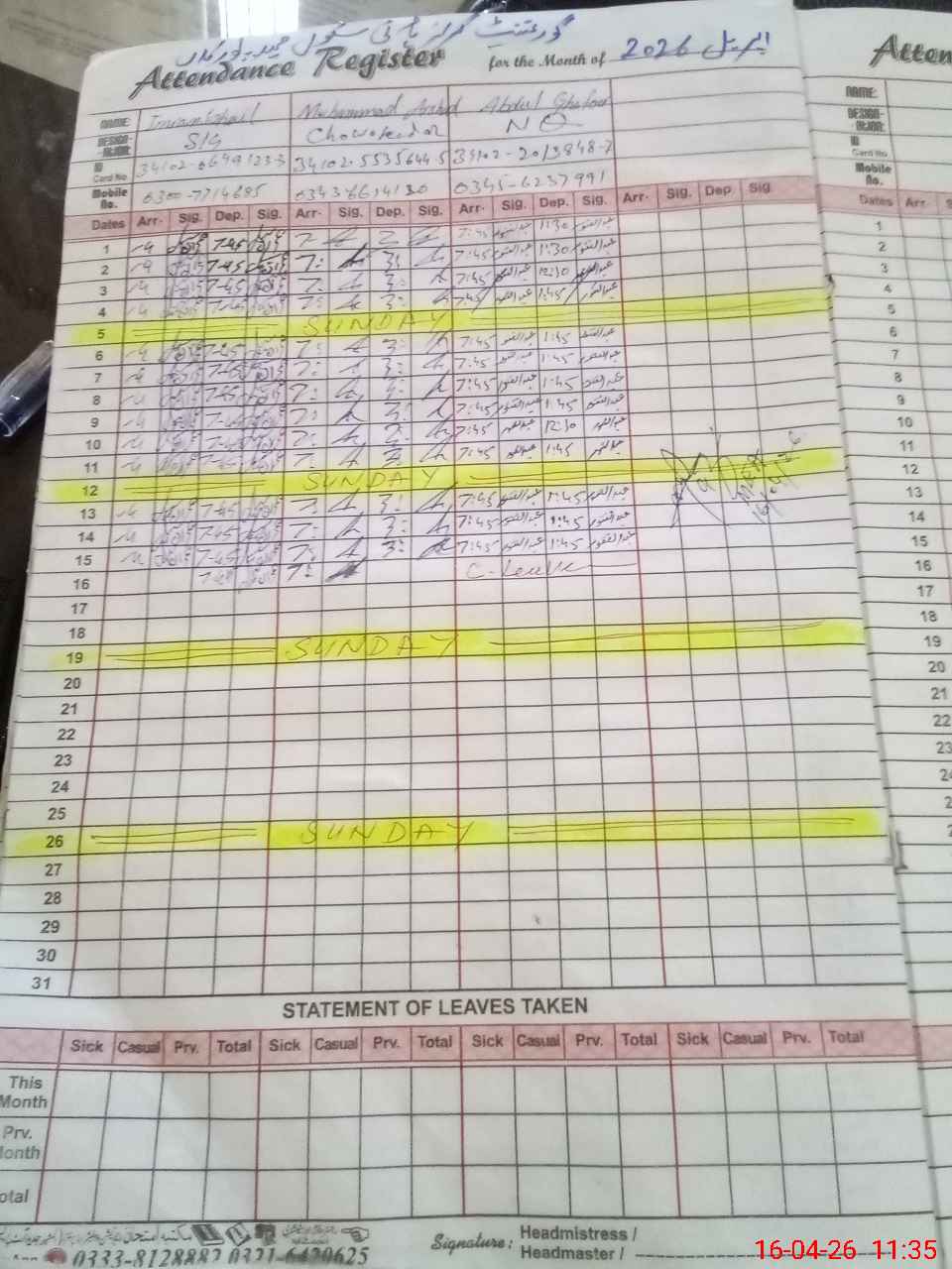 | CNIC | Full Name | Designation | R/C | Absence During Last Calender Month |