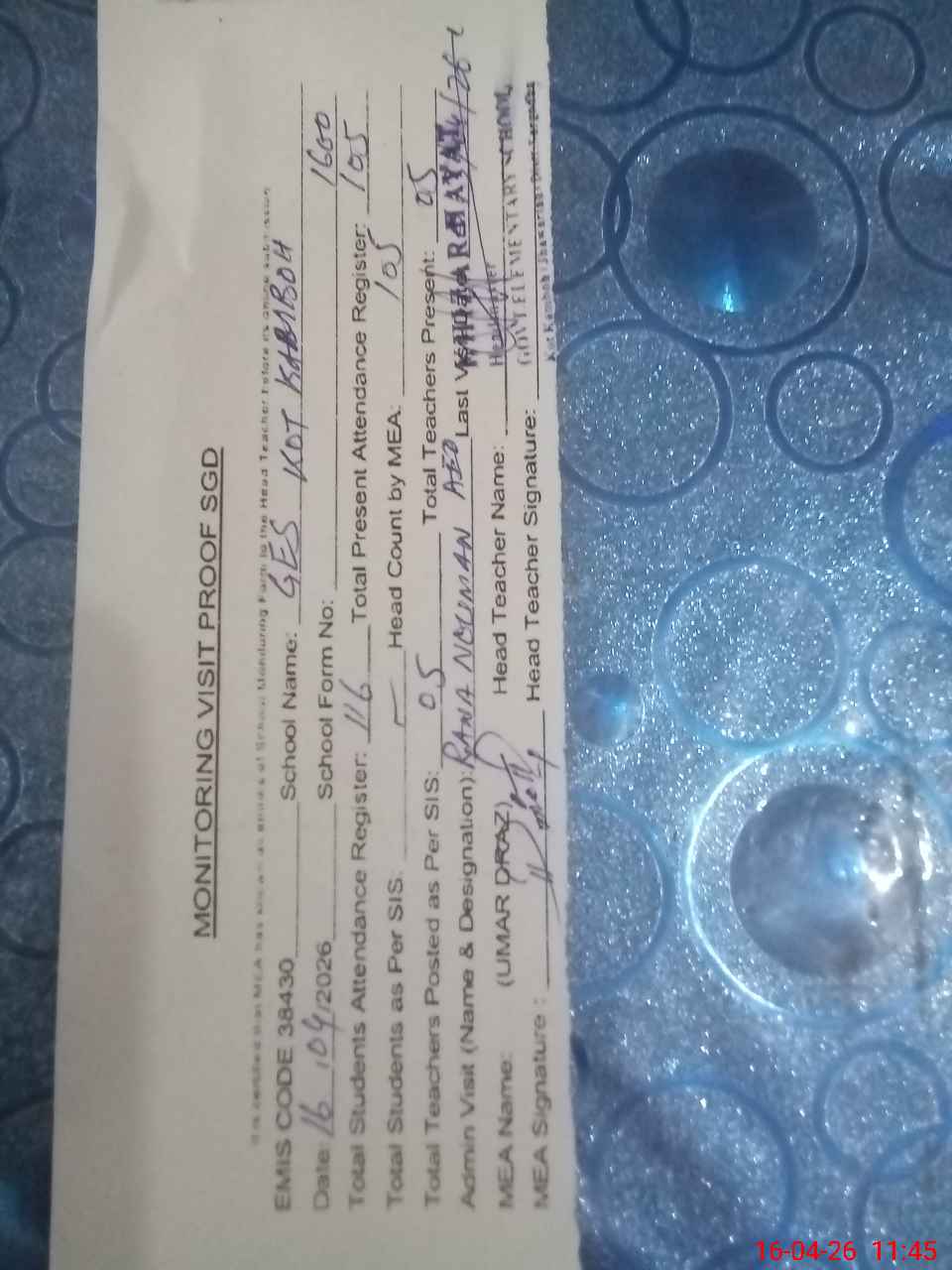 | Attendance Register | Head Teacher | MEA with School | Visit Proof |