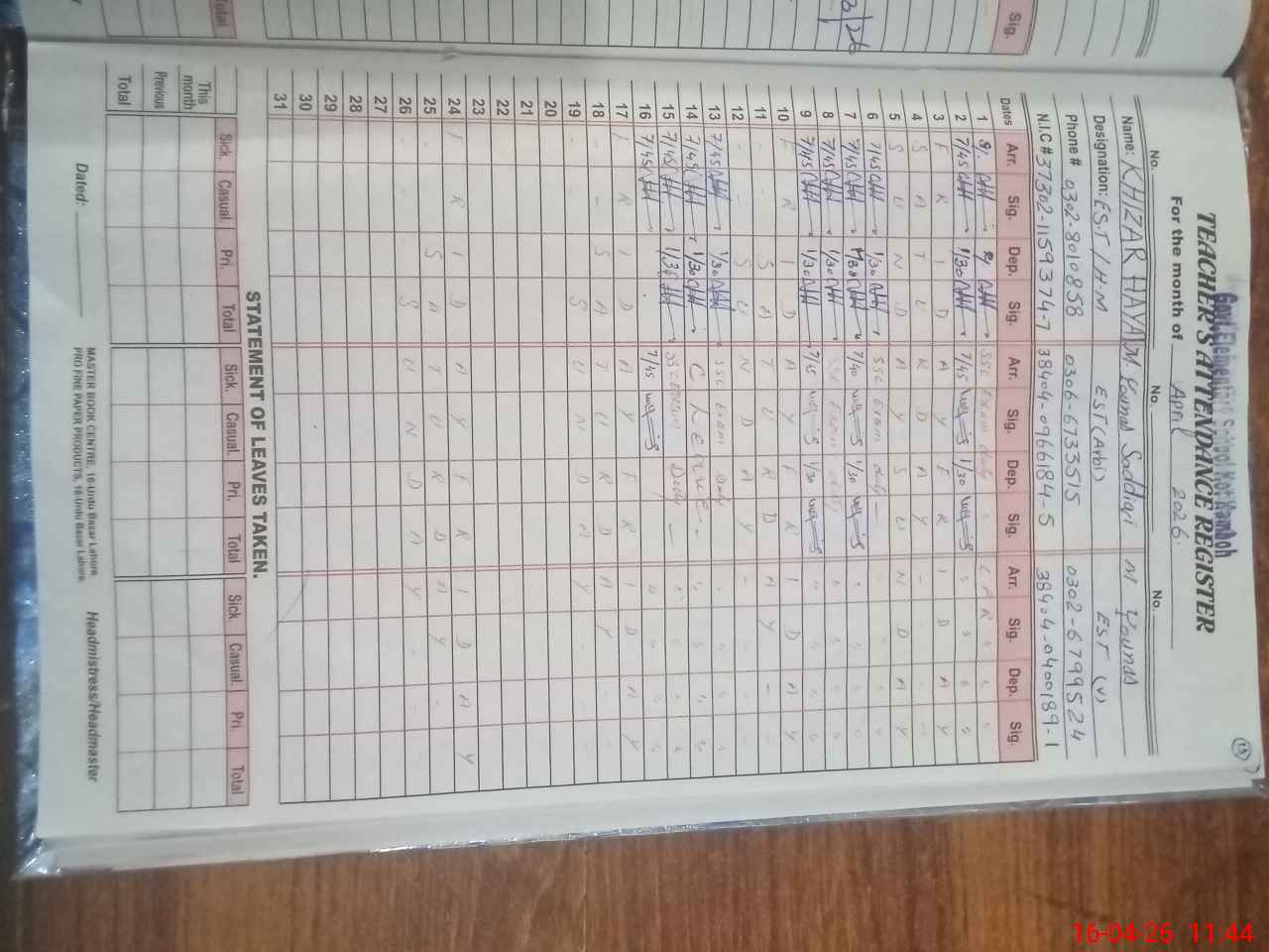 | Name: Kh**** Ha**** Designation: (School Headmaster's/Headmistress's) EST I/C HEADMASTER Phone/Cell Number: 03**** |