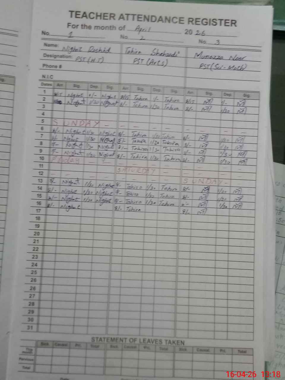| Name: TA**** SH**** Designation: (School Headmaster's/Headmistress's) PST Phone/Cell Number: 03**** |