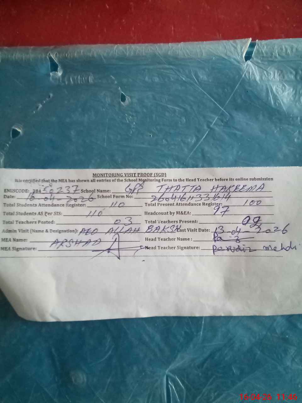 | Attendance Register | Head Teacher | MEA with School | Visit Proof |