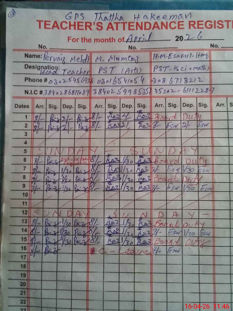 | CNIC | Full Name | Designation | R/C | Absence During Last Calender Month |
