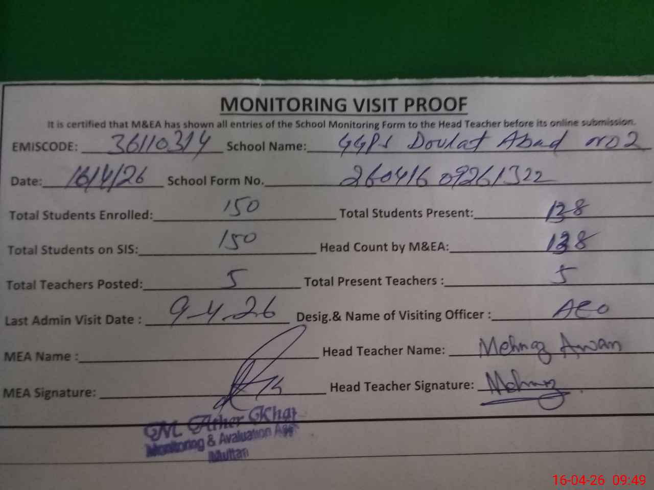| Attendance Register | Head Teacher | MEA with School | Visit Proof |