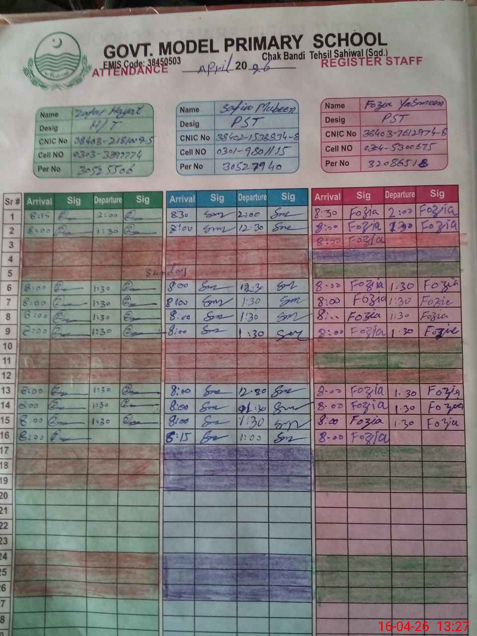 | CNIC | Full Name | Designation | R/C | Absence During Last Calender Month |