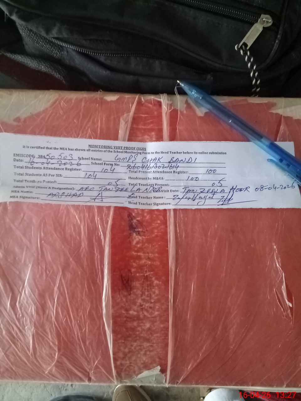 | Attendance Register | Head Teacher | MEA with School | Visit Proof |