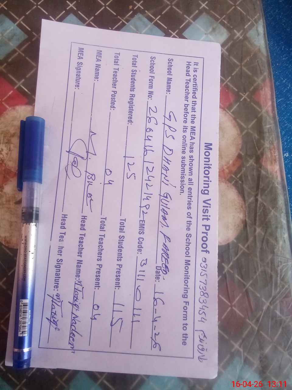 | EMIS Code: 31110111 | Name of School: GPS DHANI GHULAM FAREED | |||