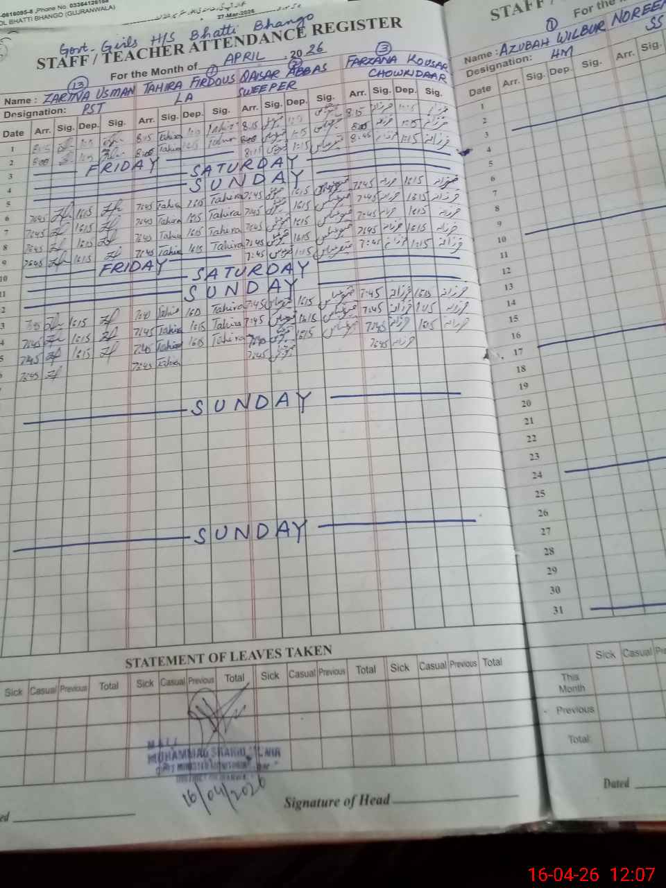 | 34**** | Ta**** Am**** | EST Urdu | Regular | 0 | 0 | 0 | 0 | 0 | 0 | 0 | 0 | 0 | Absent (Un-Authorized) |