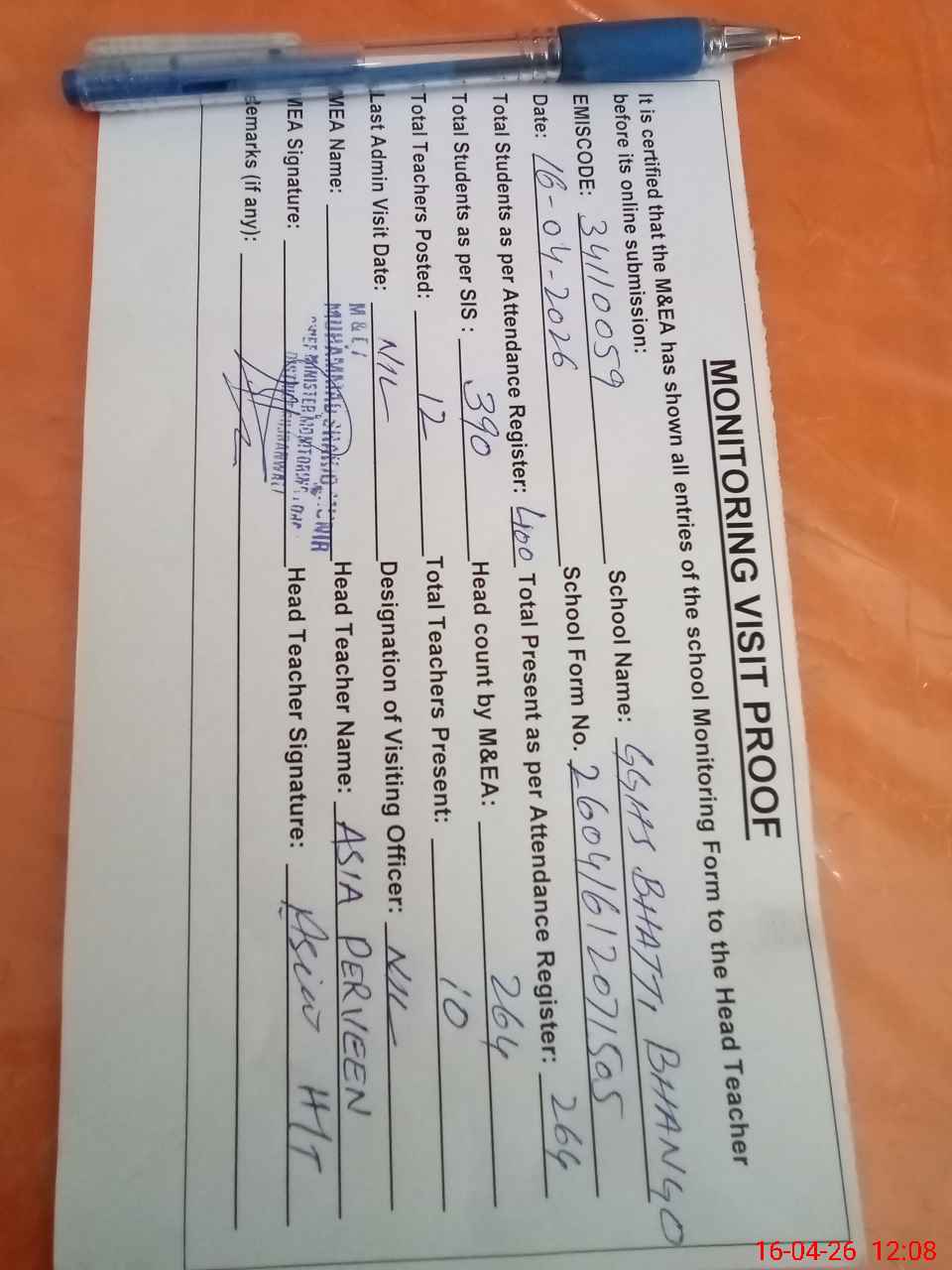 | Attendance Register | Head Teacher | MEA with School | Visit Proof |