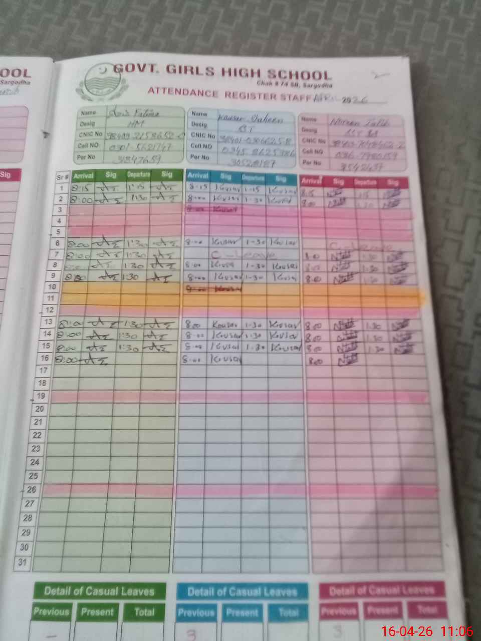 | CNIC | Full Name | Designation | R/C | Absence During Last Calender Month |