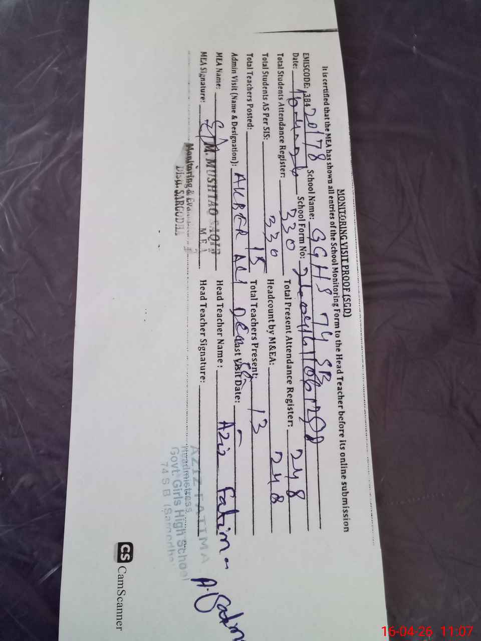 | Name: AZ**** FA**** Designation: (School Headmaster's/Headmistress's) HEADMISTRESS Phone/Cell Number: 03**** |