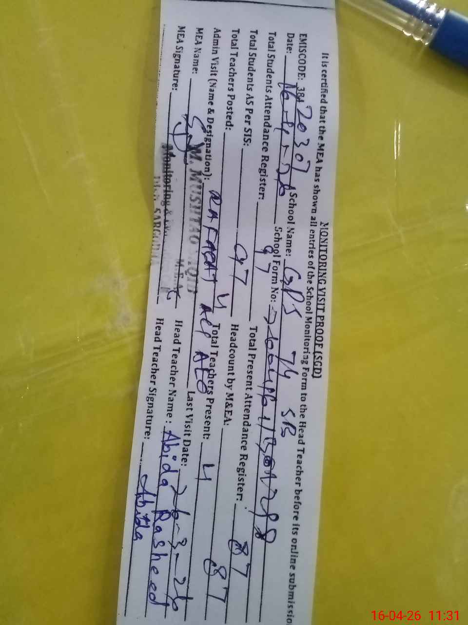 | Attendance Register | Head Teacher | MEA with School | Visit Proof |