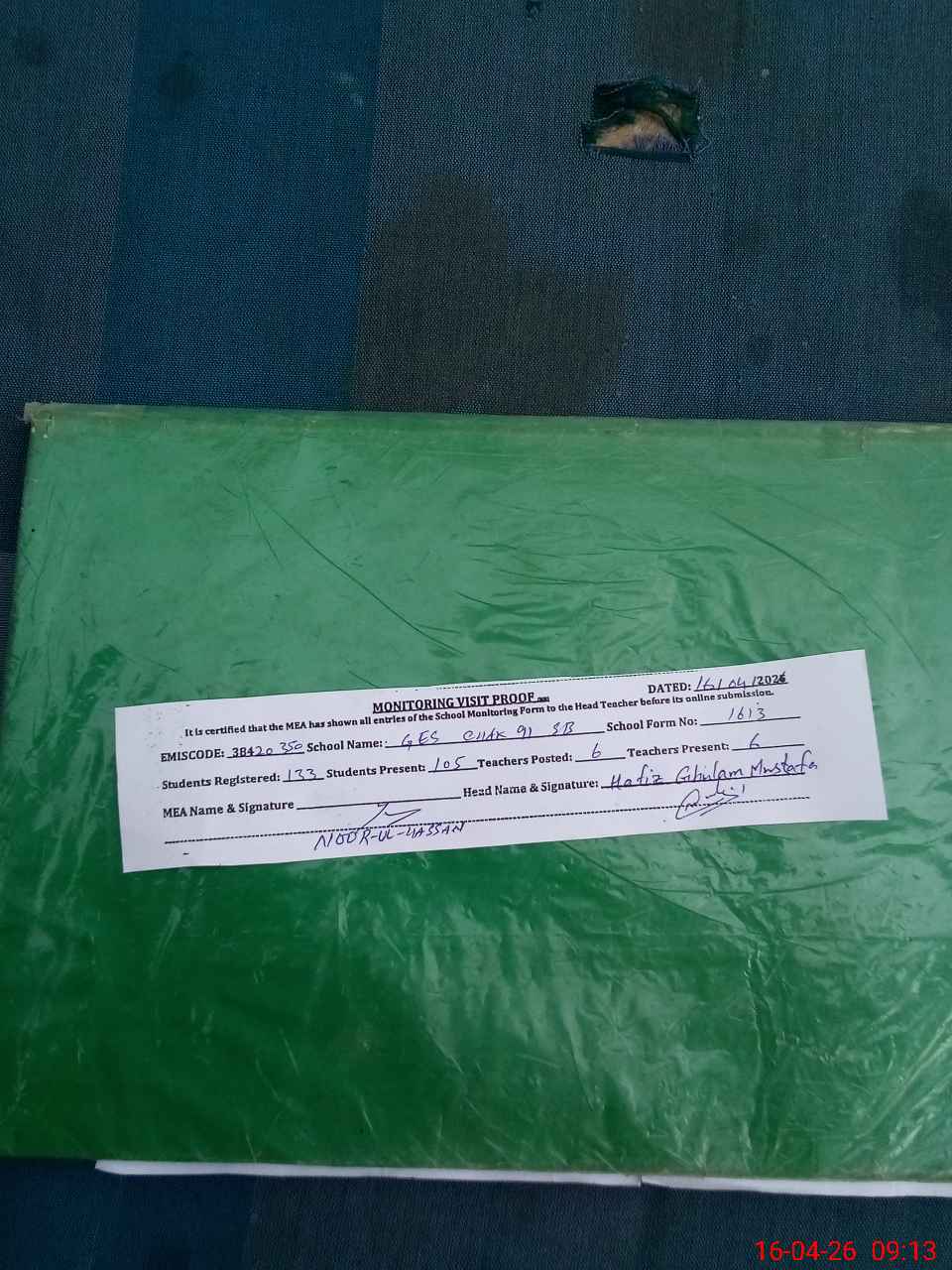| Attendance Register | Head Teacher | MEA with School | Visit Proof |