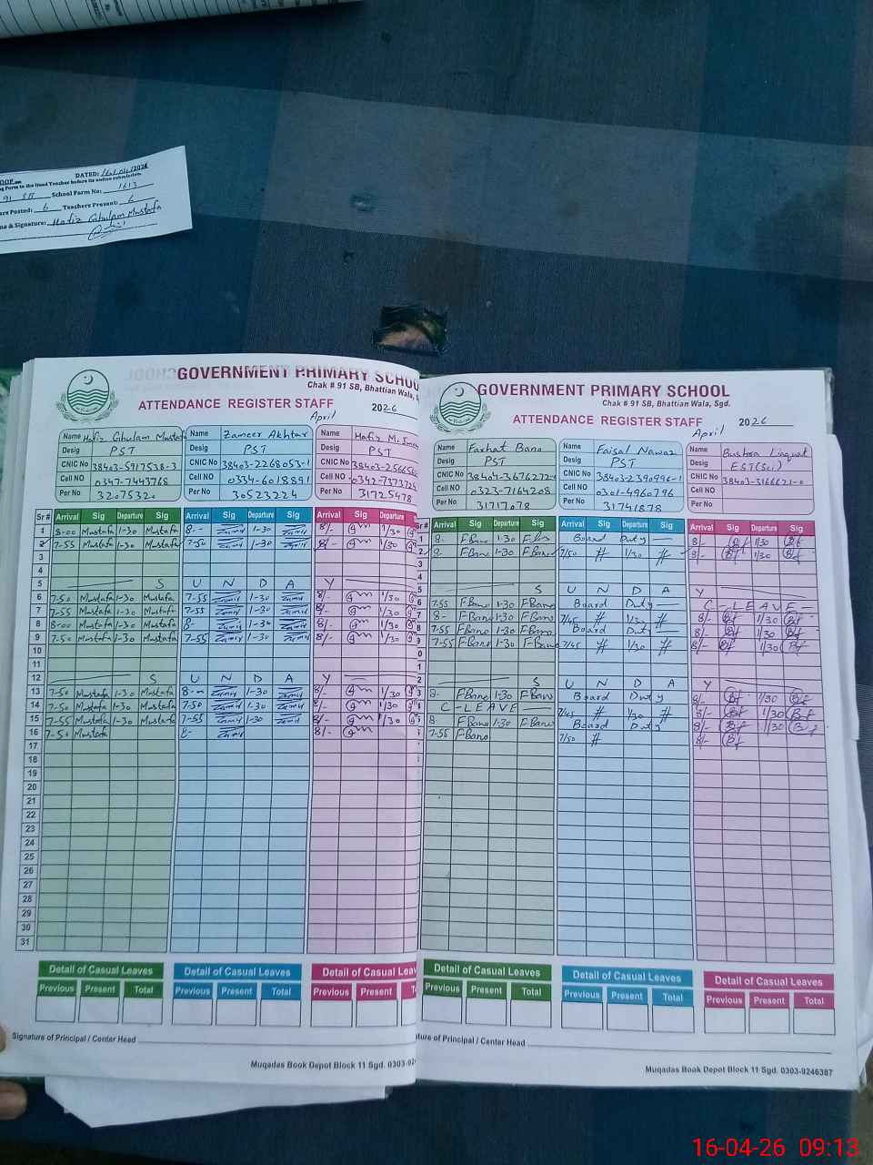 | CNIC | Full Name | Designation | R/C | Absence During Last Calender Month |