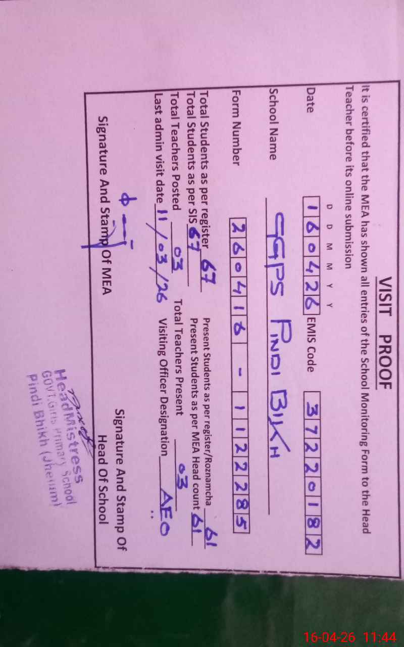 | EMIS Code: 37220182 | Name of School: GGPS PINDI BIKH | |||