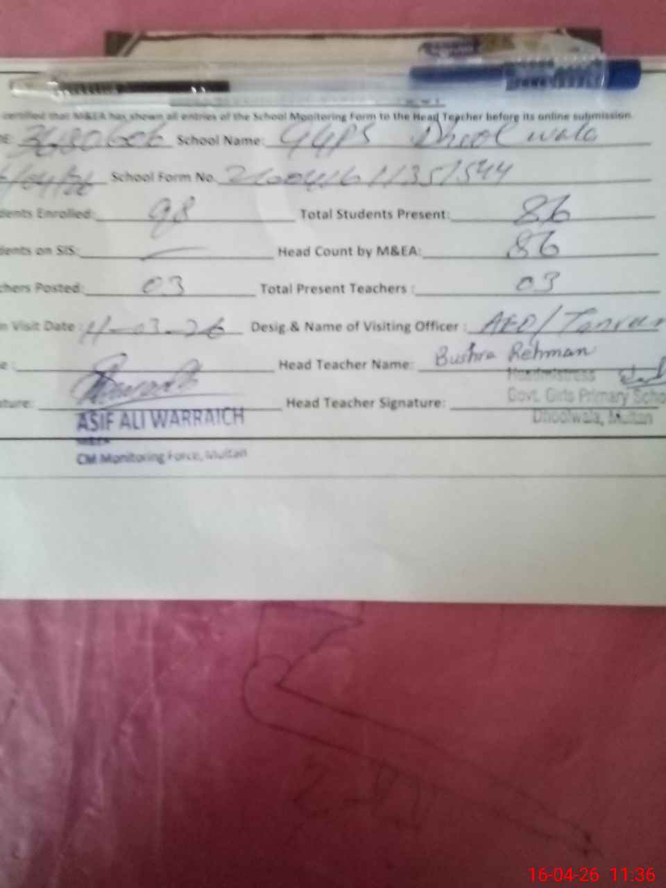 | Attendance Register | Head Teacher | MEA with School | Visit Proof |
