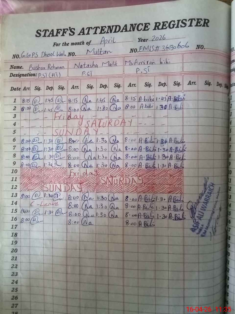 | CNIC | Full Name | Designation | R/C | Absence During Last Calender Month |