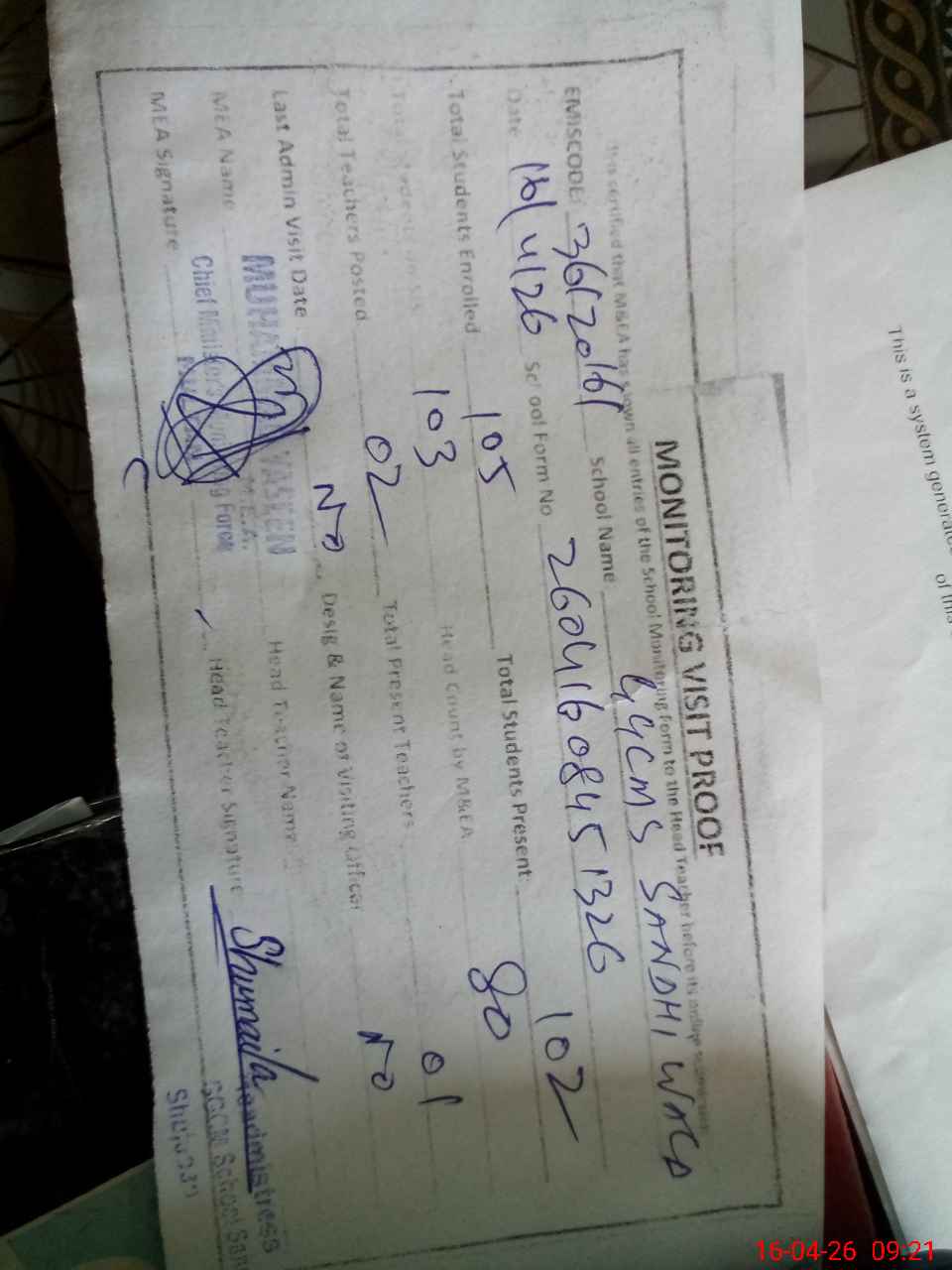| Attendance Register | Head Teacher | MEA with School | Visit Proof |
