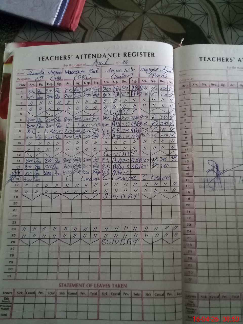 | Leave | Duty | Absent | Maternity | Medical | Ex- Pak |